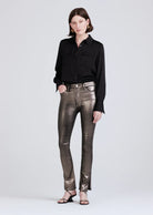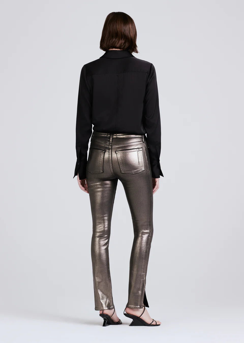 The Kyle High Rise Legging is a skinny style with a metallic coated finish that gives it a leather look. It features a fitted cut that hugs the legs and releases slightly around the ankles with side seam splits.